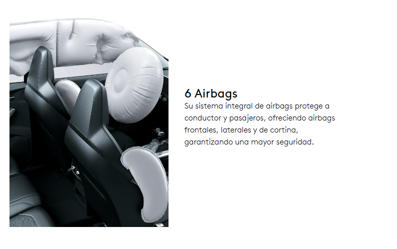 - 6 airbags de serie (frontales, laterales y de cortina) para máxima protección de conductor y pasajeros.